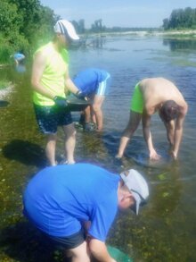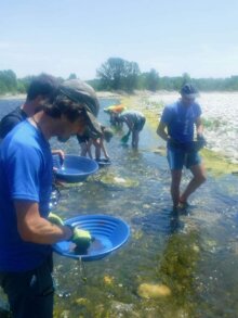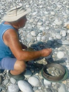 Il terzo punto di ricerca, noto ai vecchi cercatori di Oro In Natura, è stato in quel che rimaneva della “punta Canoa” ed è stato il punto che ha dato maggiore soddisfazione a ogni partecipante… forse perché nessuno era passato a sterilizzare l’area con le pompette. Tutti i cercatori sarebbero rimasti lì a scavare, ma ci aspettavano ancora più di 6 chilometri di fiume da percorrere, in un tratto in cui la corrente è parecchio lenta. Comunque, durante la lunga navigazione abbiamo potuto apprezzare le sponde abitate dal gruccione e poi quelle occupate dai numerosi bagnanti con tanto di sdraie in acqua e radio a massimo volume…