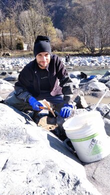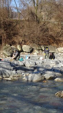 Finalmente giunti al primo punto di ricerca abbiamo fatto un pochino di lezione teorico-pratica a chi per la prima volta si approcciava alla ricerca dell’oro nel Ticino. Abbiamo mostrato come riconoscere una “punta di magra”, osservare l’embricatura delle pietre e le tracce di un arricchimento di minerali pesanti in funzione del ritrovamento aurifero.